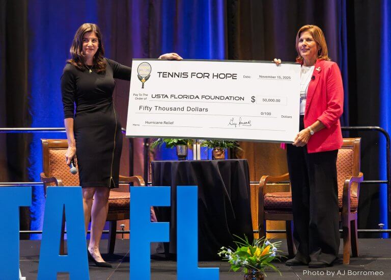 A major moment at the first-ever USTA Florida Tennis Summit came when Gigi Fernández presented a $50,000 donation from Tennis For Hope to the USTA Florida Foundation’s Hurricane Relief Fund.